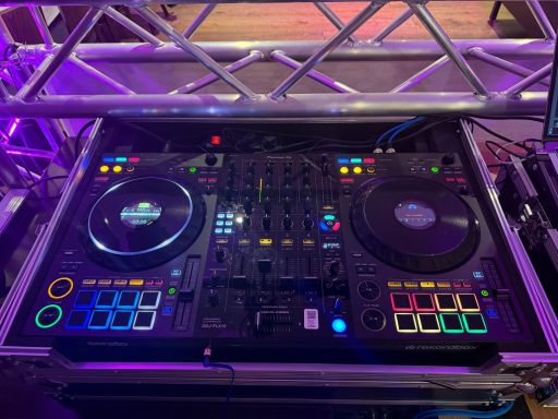 Wir erscheinen ca zwei Stunden vorher und bauen alles auf. Wir nutzen professionelle Technik aus dem Hause Pioneer DJ, QSC Audio, DMX gesteuertes Licht.