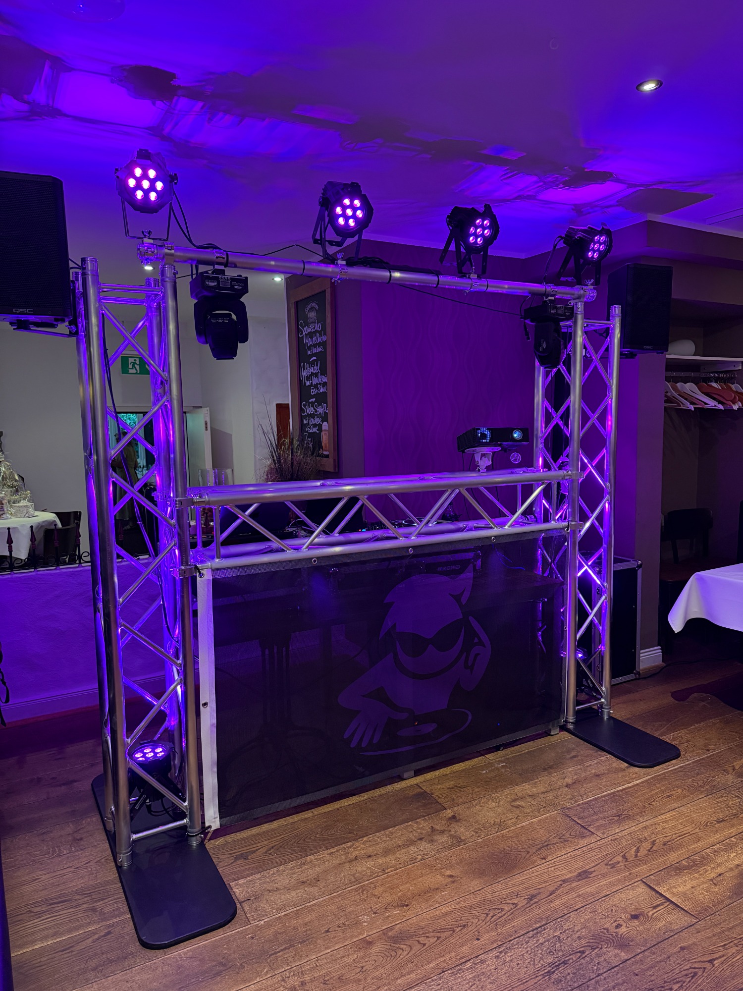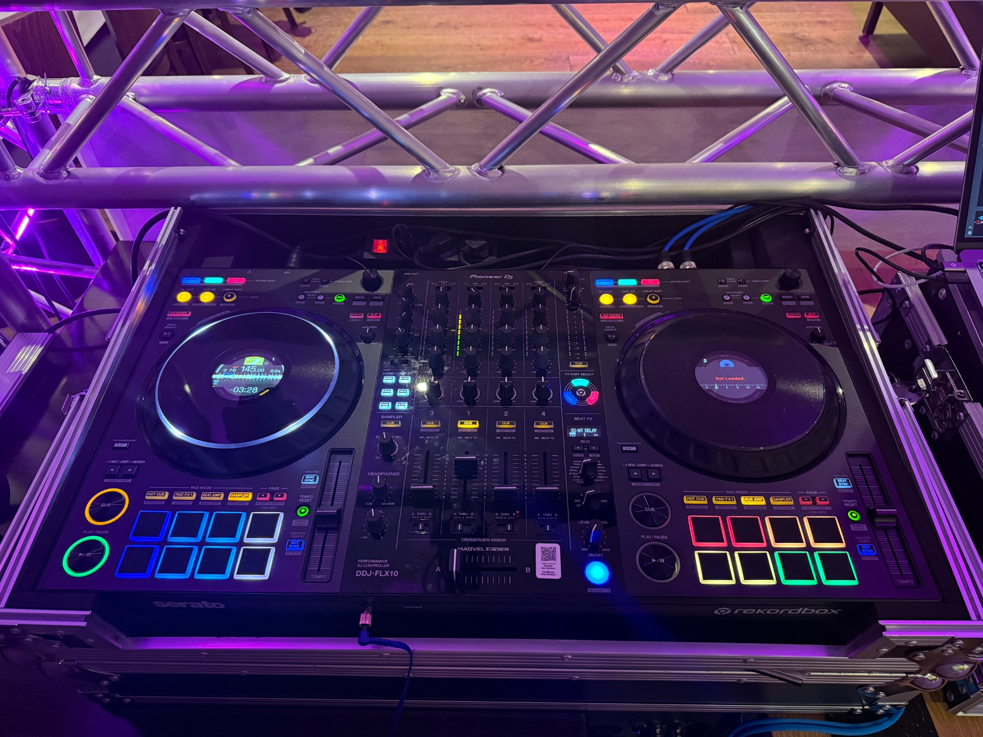 Wir erscheinen ca zwei Stunden vorher und bauen alles auf. Wir nutzen professionelle Technik aus dem Hause Pioneer DJ, QSC Audio, DMX gesteuertes Licht.